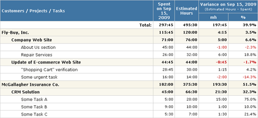 Spent time and variance between estimated and spent time are calculated on the date specified in the report parameters.